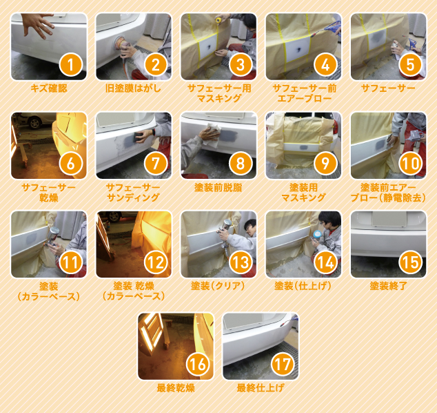 キズ修理 △ ○ ◎ ヘコミ修理 × ○ ◎ 色合わせ △ ○ ◎ 部分塗装 △ ○ ー 全面塗装 × × ◎ ゴミ取り作業 × ○ ◎ 塗装肌調整 × △ ◎